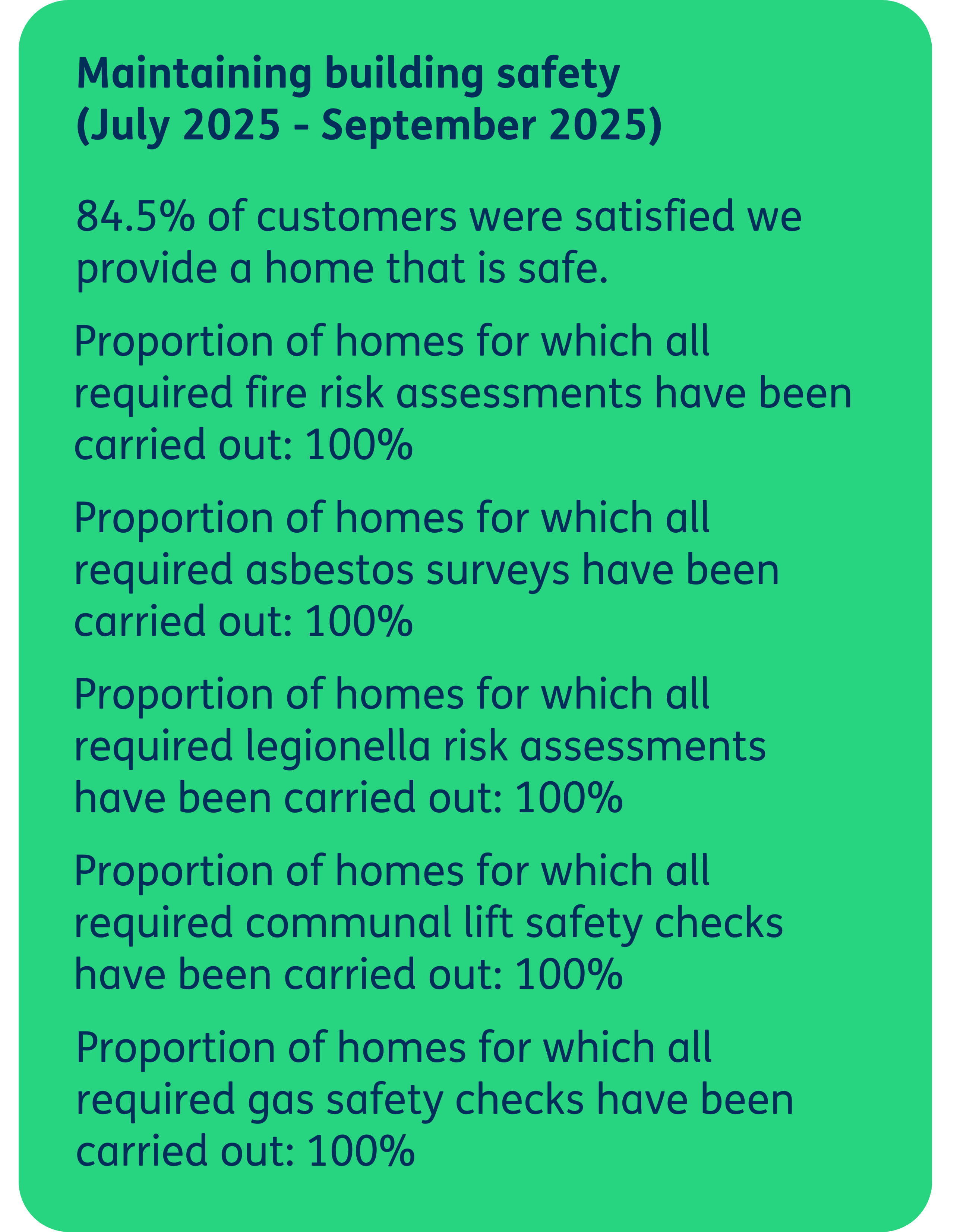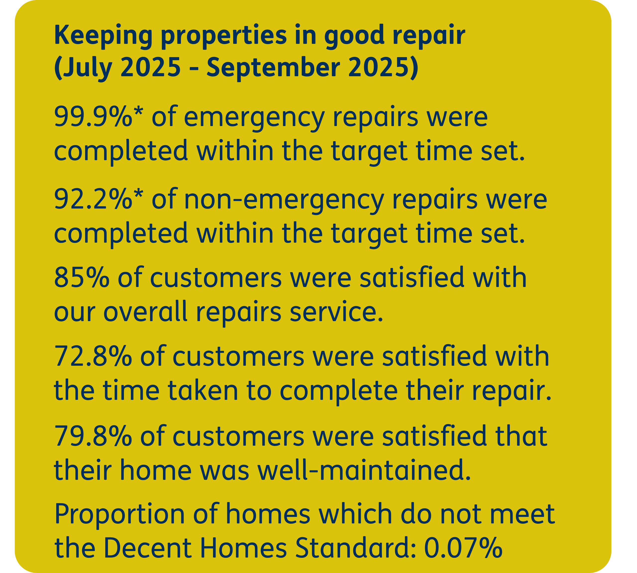 Our highest score overall was 85.2% of our customers said we treat them fairly and with respect. Closely followed by satisfaction with our repairs service at 85%, and satisfaction that their home is safe at 84.5%.